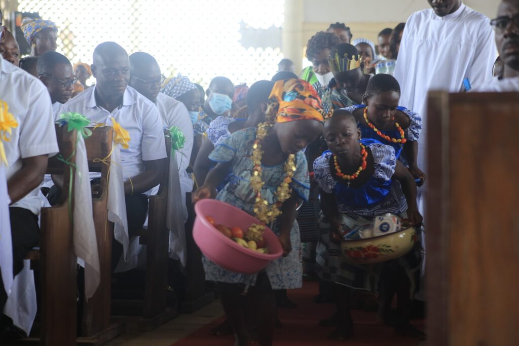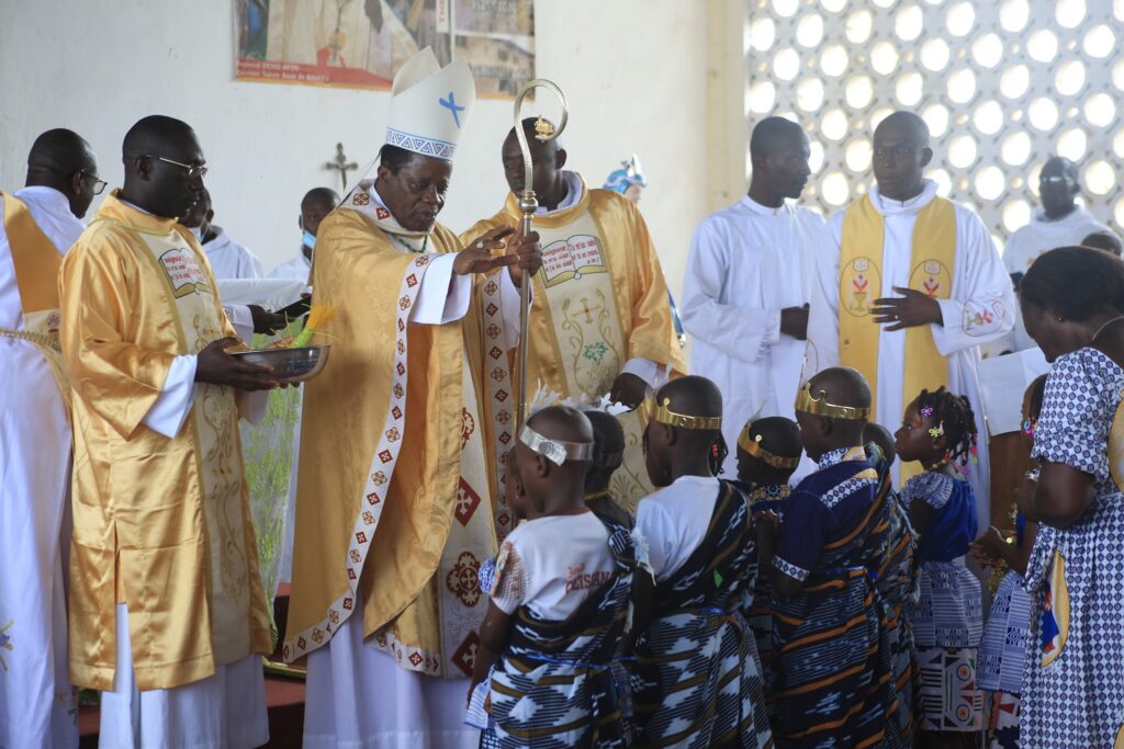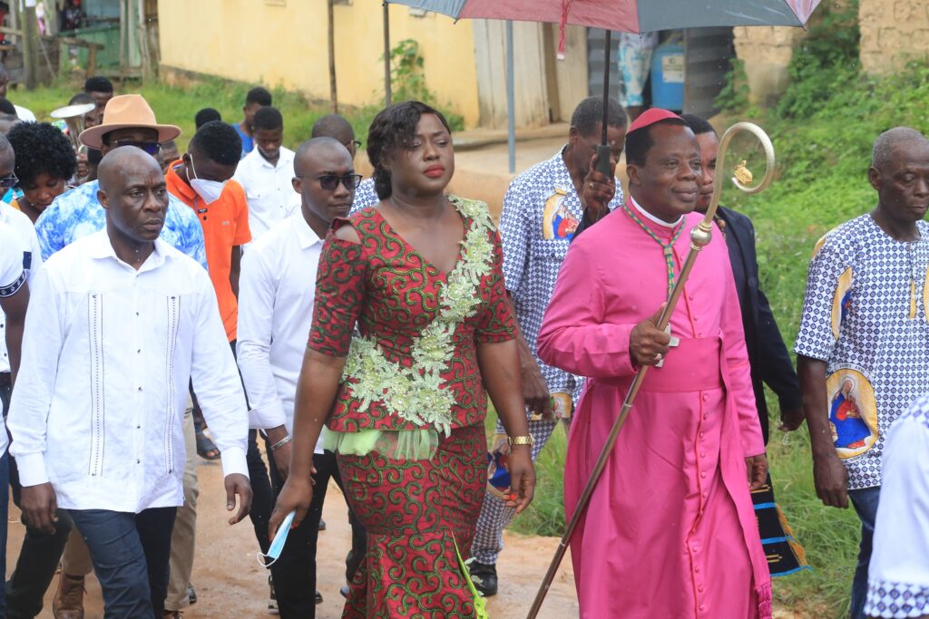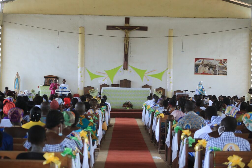 La journée a débuté par une belle procession joyeuse conduite par l’Evêque lui-même, entouré de tout le clergé local, depuis la place publique jusqu’à la paroisse. Tous les fidèles étaient endimanchés. Le groupe liturgique bien inspiré avec des monitions à propos, les chorales ont entonné leur meilleur répertoire, les quêteuses et le service d’ordre bien en place…