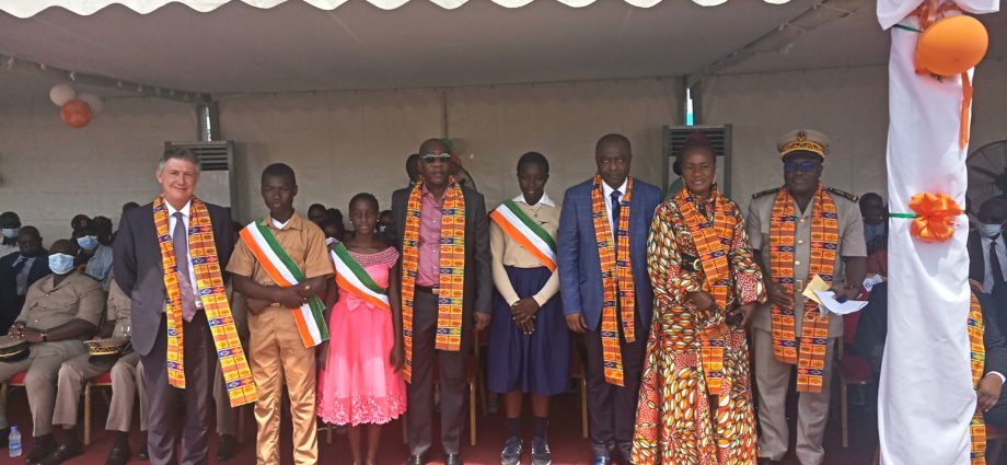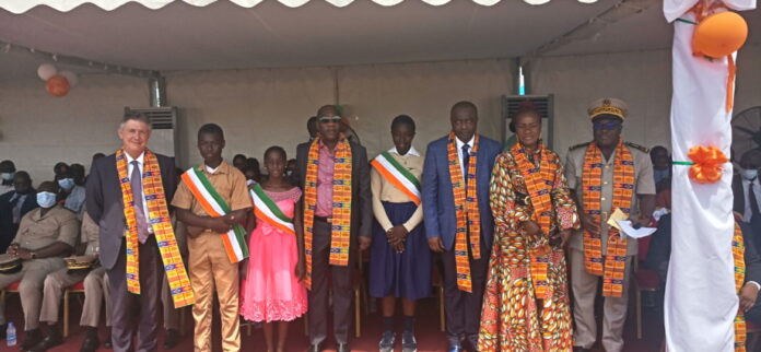 Le ministre de l’Environnement et du Développement durable, Assi Jean-Luc, représentant le Premier ministre Patrick Achi posant avec des officiels et des enfants.